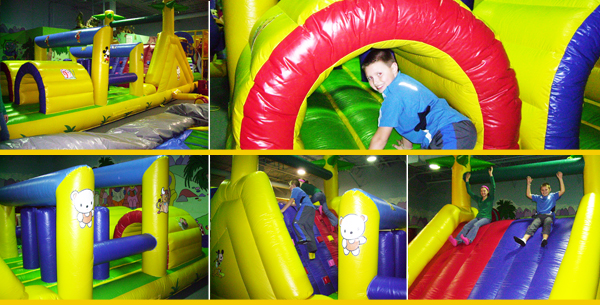 With shoes off, start at the tunnel end and race through it to the bobbers, dodge your way through and climb the wall, then slide down to the finish. Race around and tag your buddy to start their turn.
