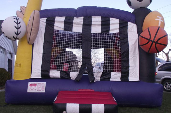 This large square bouncer with a closed top, is perfect for sunny days. With large mesh windows all around, this bouncer is always a hit for any sports fan! This bouncer is loads of fun with an oversized bounce area and two basketball nets inside.